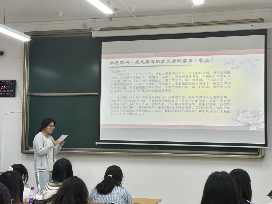 在红色家书诵读环节,同学们一起诵读了高文华、赵一曼等革命先辈的家书。一字一句间,革命先辈的家国担当与铁骨柔情跃然眼前。