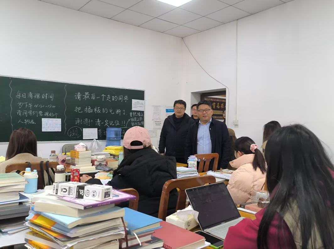 考研临近,为帮助我院考研学子舒缓心理压力,增强考研学子上岸信心,鼓舞考研士气。2025年12月8日,校党委常委、副校长陈艳波深入文学院考研自习室,为奋战学子送上关怀与鼓励。文学院党委书记陈爱东、党政办副主任肖玉婷、辅导员曹家鹏参加。