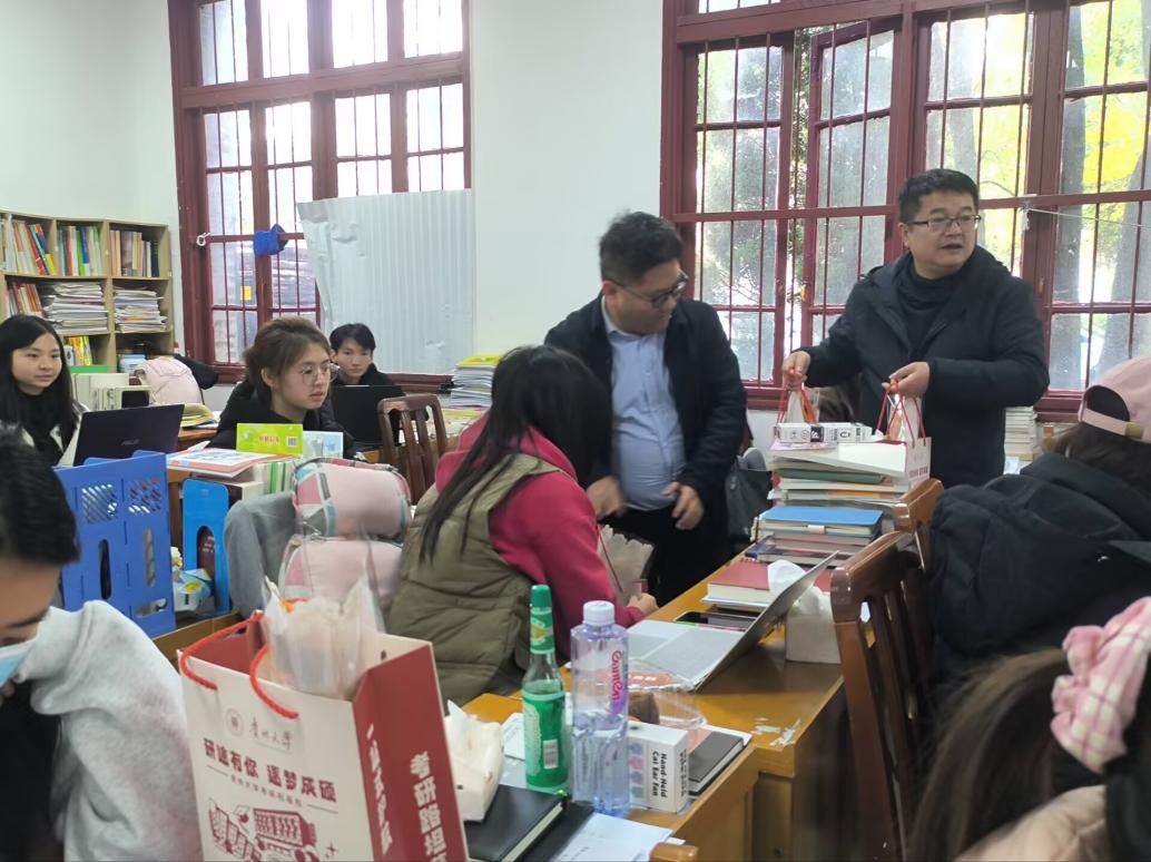 最后,陈艳波副校长与学院领导、老师们一起为考研学子赠送祝福包,鼓励大家坚定目标、沉着应考、一战上岸!