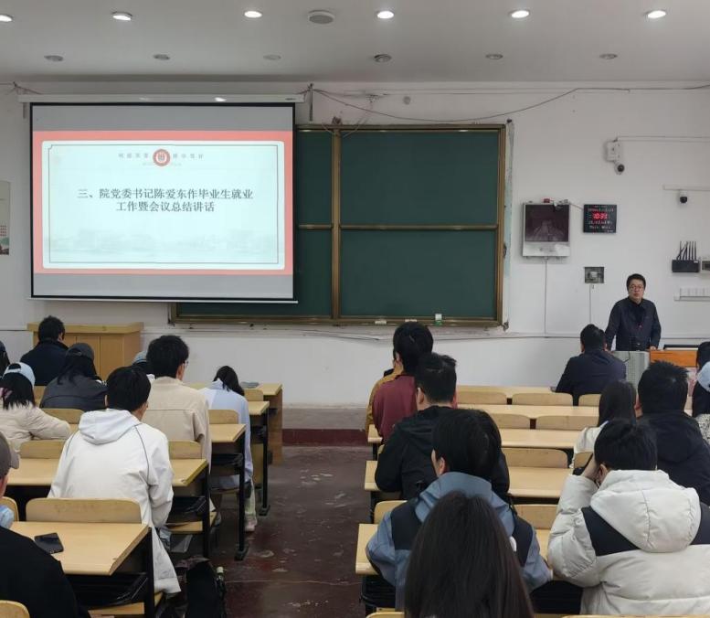 陈爱东作总结讲话,他对同学们提出三点要求:一是立心,坚定理想信念,树立正确的就业观与人生观,找准人生方向;二是守正创新,坚守道德底线与学术准则,同时勇于突破自我,提升综合竞争力;三是勇担社会责任,将个人发展与社会需求相结合,在就业与未来工作中践行青年担当。